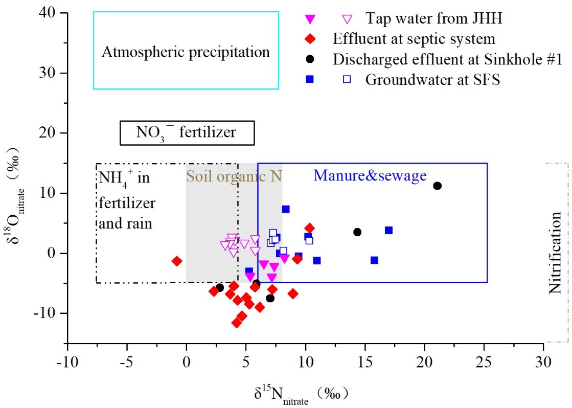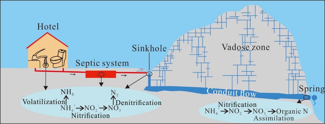 近几十年来,地下水硝酸盐污染成为国内外最普遍、污染面积最大的地下水污染问题,威胁着生态环境和人类的供水安全。水体硝酸盐污染最显而易见的危害就是水体富营养化。人类饮用过高硝酸盐浓度的水会引起高铁血红蛋白症、癌症、基因损坏和甲状腺肿大等疾病,严重威胁人类的生命健康。而在喀斯特地区,由于地下水流系统具有高渗透性的特征,地下水极易受到硝酸盐的污染,且难以治理。基于此,番号 杨平恒教授课题组在前期十余年野外观测研究工作的基础上,对位于金佛山喀斯特世界遗产地内的水房泉小流域地下水硝酸盐及其同位素开展了2个水文年的监测,从地下水硝酸盐补给、径流和排泄的角度研究了地下水氮循环机理。
