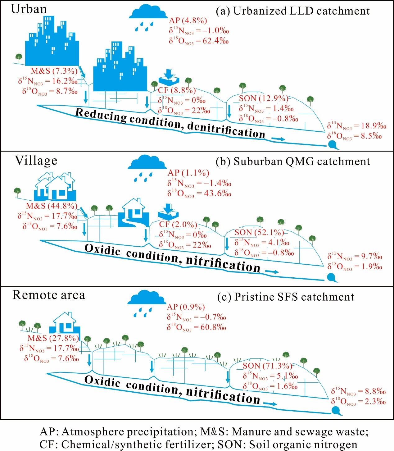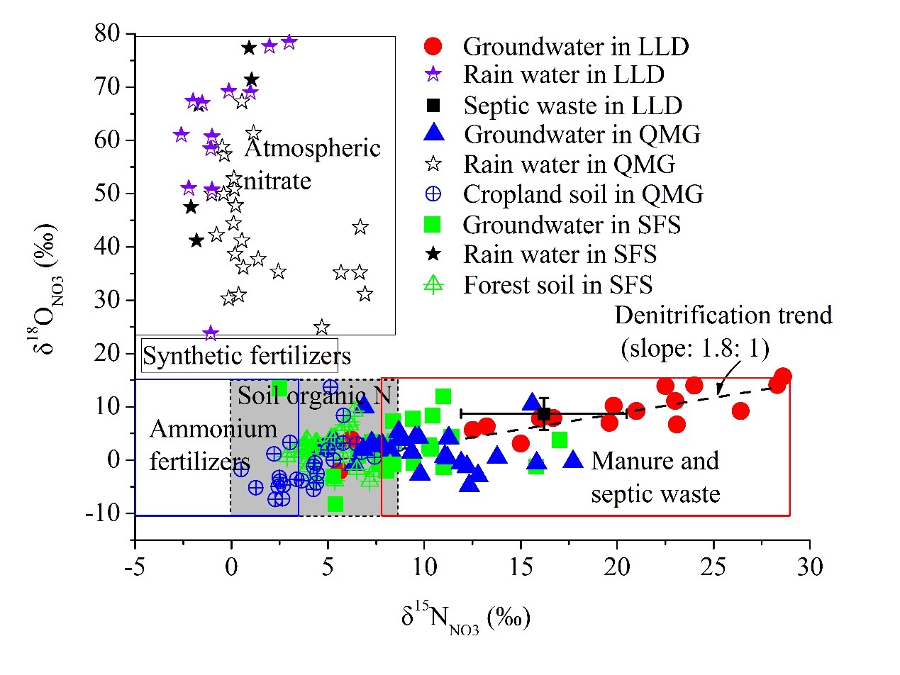 硝酸盐(NO3)是生命体运行必不可少的营养物质。然而,自然界水体中过高的硝酸盐浓度会带来一系列的环境危害,如富营养化;人类饮用过高硝酸盐浓度的水则会严重威胁人类的生命健康,如引起高铁血红蛋白症、癌症、甲状腺肿大,损坏基因。二战后至今,过量的施肥、无序的污水排放等人类活动是造成水体硝酸盐浓度超标问题的主要原因,威胁着生态环境和供水安全。因此,如何精确定位硝酸盐的污染源头,辨别硝酸盐随水流运动所发生的浓度富集和生物降解等过程,是硝酸盐污染防治最为关键的科学问题。