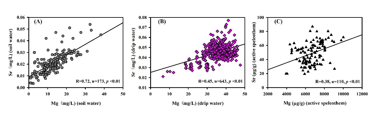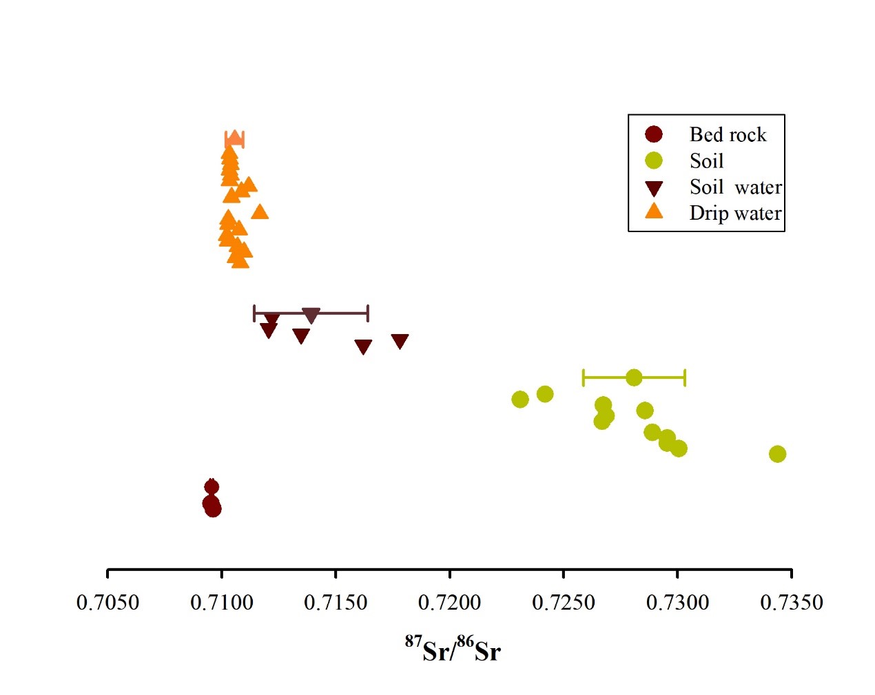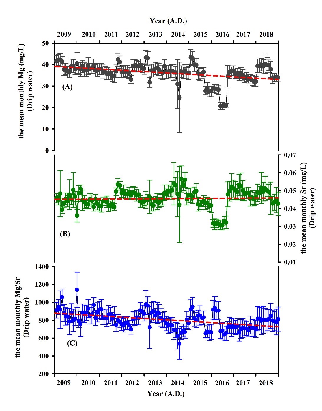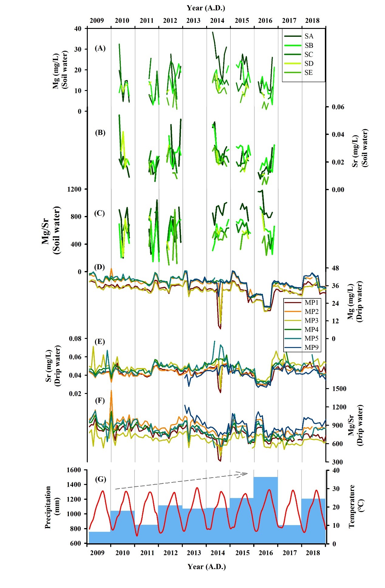 李俊云副教授和李廷勇教授团队自2005年起,在重庆芙蓉洞建立了洞穴监测系统,已经发表了多篇研究论文。在本研究中,利用2009-2018年期间对地表土壤、土壤水、基岩、洞穴滴水、洞穴新生碳酸盐沉积物等的监测,详细进行了MgSrMg/Sr比值以87Sr/86Sr比值的分析,并与监测期间的区域月降水量和年降水量进行了对比。