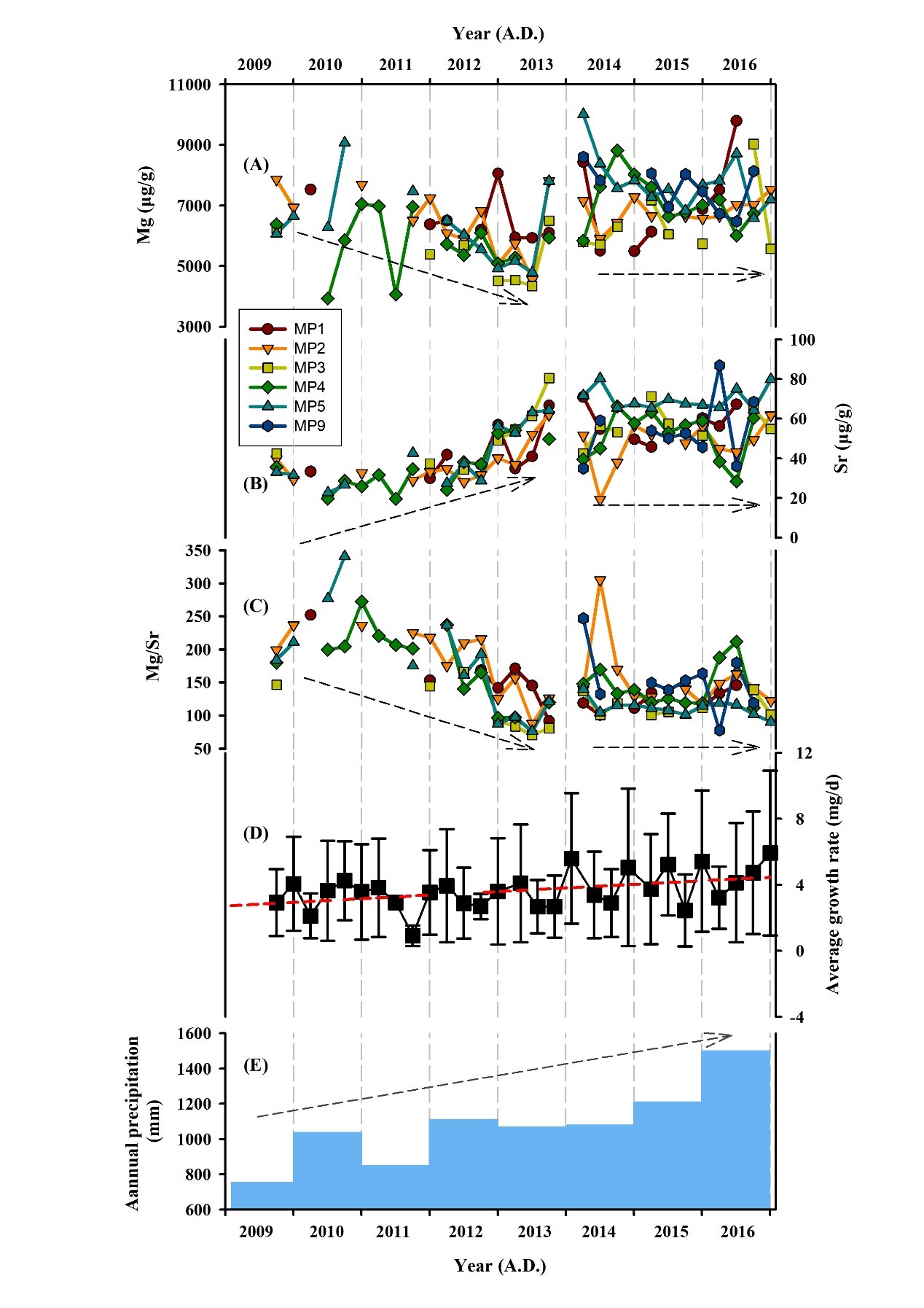 研究发现,重庆地区冬春季节降水量的减少,引起水——土相互作用时间延长,导致土壤水中MgSr浓度升高以及87Sr/86Sr比值的增大,说明土壤水中这些微量元素含量的变化可以反映季节性的降水量变化。滴水中的MgSr浓度大于土壤水中,而且滴水中87Sr/86Sr与基岩中相似,则说明基岩是洞穴滴水和洞穴次生化学沉积物中微量元素的主要来源。在多年时间尺度上,滴水中的Mg浓度和Mg/Sr比值减小,则可能归因于整个监测时期区域年降水量的整体增加,导致水岩相互作用时间缩短。而现代沉积物中Sr浓度的变化则可能受到晶体生长速率的影响。虽然芙蓉洞上覆基岩厚达数百米,大气降水在基岩中的混合效应使得滴水和新生碳酸盐中的MgSr含量和Mg/Sr比值都没有表现出季节性的变化特征;但是本研究第一次通过实证观测,证明了在年际——年代际的长时间尺度上,拥有数百米厚层基岩的封闭岩溶洞穴,其次生碳酸钙沉积物中的元素地球化学指标,仍旧可以反映区域水文环境的变化,这对于古气候重建具有重要意义。