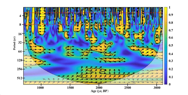 {C}(2) {C}{C}{C}{C}交叉谱分析表明δ18O和δ13C具有3-8, 10-15, 50-80, 256-512年等共同周期。对δ18O进行经验模态分解(Ensemble Empirical Mode decomposition) 表明7年的周期贡献率最大。这表明晚全新世在年代际—百年时间尺度上频繁的ENSO事件主控了亚洲夏季风变化。而晚全新世ITCZ向南移动可能造成了ENSO事件的频率增加。