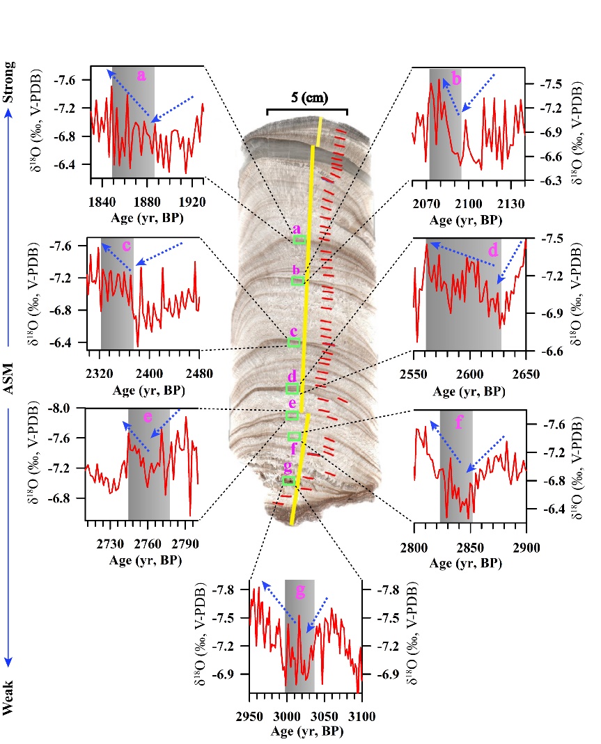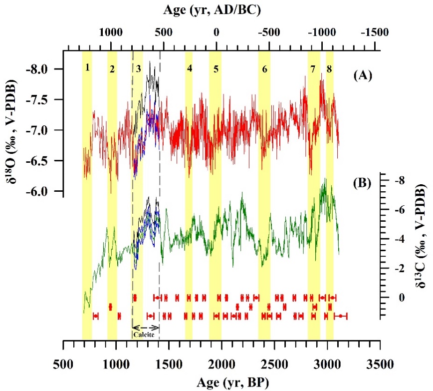 {C}(1) {C}{C}{C}δ18O和δ13C呈现正相关。在694-779, 1013-911, 1282-1172, 1736-1638, 1961-1864, 2472-2375, 2931-2818, 和 3050-3014 yr BP期间发生了8次年代际到百年尺度的弱夏季风事件。