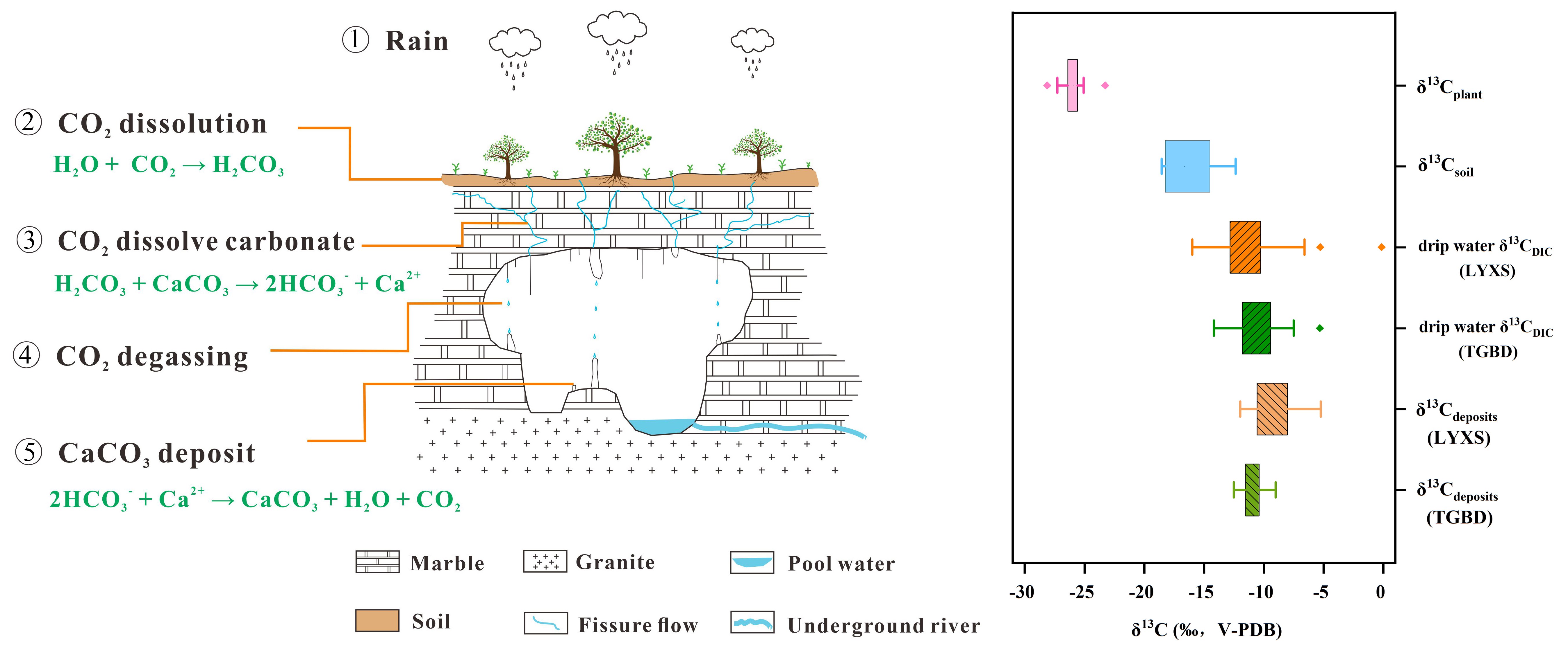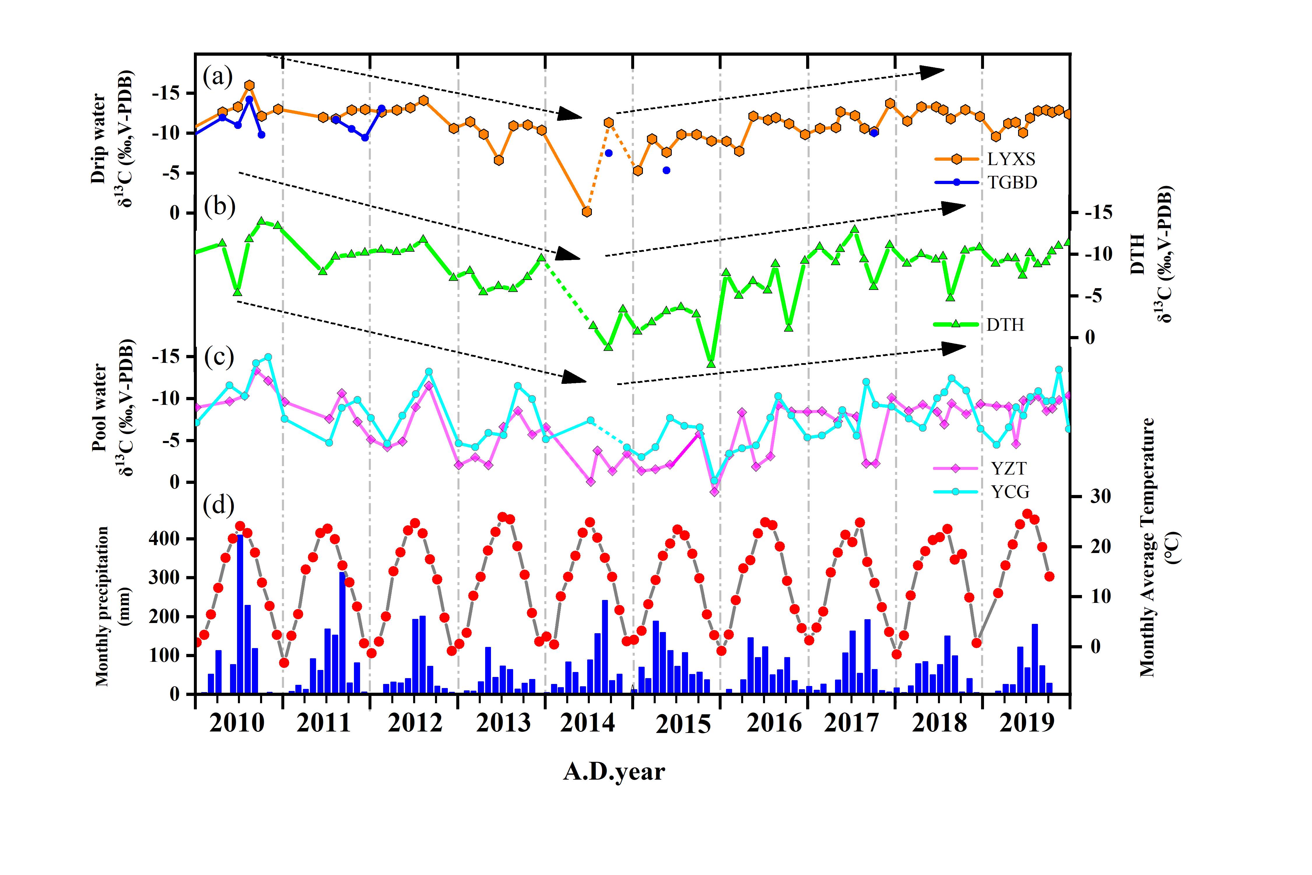 2020年12月11日,国际著名水文学期刊Journal of Hydrology (TOP期刊)在线发表了番号 、岩溶环境重庆市重点实验室杨琰教授所带领的研究小组的最新科研成果。洞穴监测可以厘清碳同位素信号在岩溶关键带中的传输过程,对揭示岩溶系统碳同位素的影响因素及其运移机制有重要意义。但是碳同位素影响因素复杂,需要通过多年监测以及近百年高分辨石笋记录来揭示不同尺度气候变化对δ13C记录的影响。
