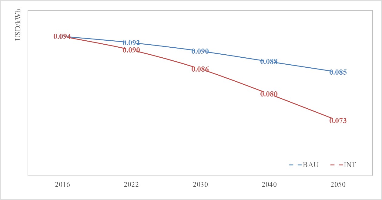 图3 2016-2050年常规情景和综合情景下的单位电力生产消耗
