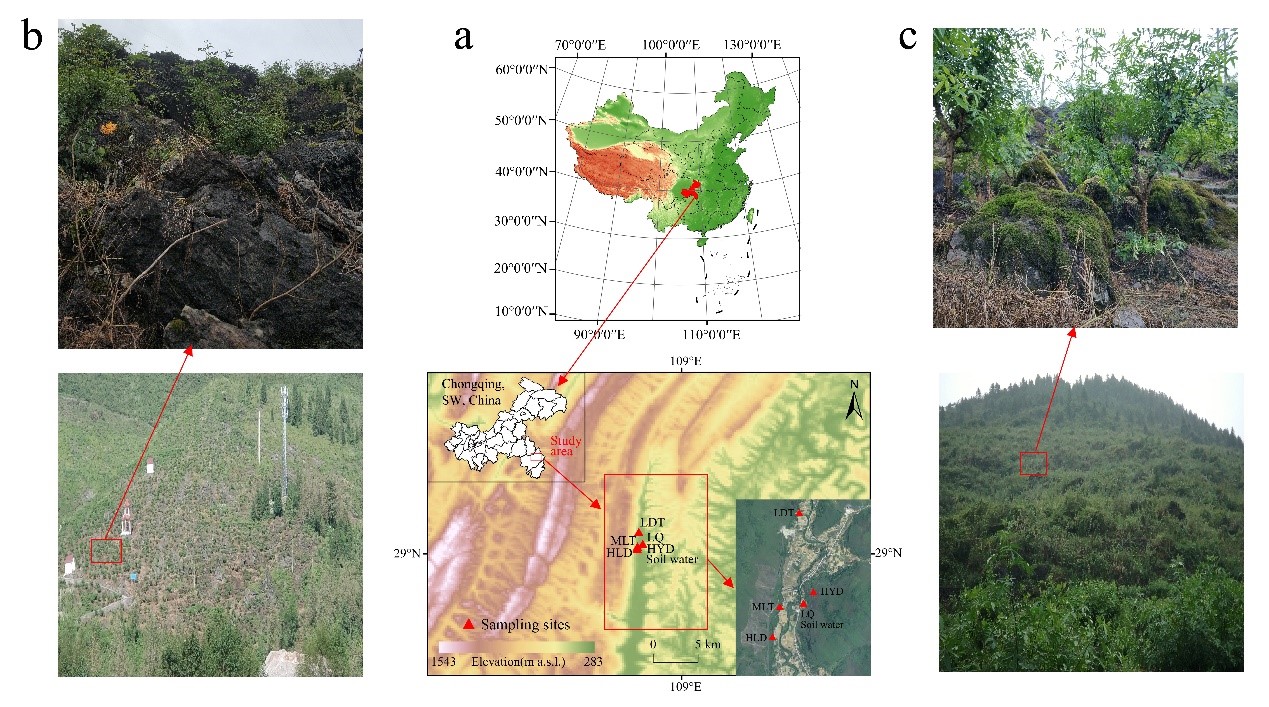 在国家重点研发计划专题项目:酉阳龙潭槽谷区水资源动态变化及环境效应研究(批准号:2016YFC050230205)和国家自然科学基金项目(41975114)等的支持下,从2017年至今,杨琰教授课题组对国家石漠化综合治理重点县重庆市酉阳进行了连续4年的监测。前人研究发现岩层倾角、倾向关系等都会导致顺/逆坡的植被覆盖程度不同;由于顺坡水土流失比逆坡严重,造成顺坡地区大面积裸露基岩发育,侵蚀影响显著。同时,岩层倾角对地表水力特征有重要影响,导致岩溶槽谷水土流失空间分布的差异。在本研究区重庆酉阳龙潭槽谷的顺/逆坡土壤覆盖、植被覆盖差异明显(图1, 图2)。因此,在相同的气候条件下,利用碳同位素研究喀斯特石漠化槽谷区植被恢复差异造成的水文生态机制及环境效应具有重要的理论及现实意义。本成果以重庆市酉阳县龙潭槽谷泔溪镇的石漠化重点治理区为研究点(图1, 图2),从2017年1月至2019年12月,监测顺/逆坡的表生泉、坡面流和土壤水中pH值、电导率、δ13CDIC、阴阳离子浓度、δ18O及δD等环境指标。另外,在强降雨条件下,对顺/逆坡不同植被覆盖区域地下水和坡面流的碳同位素等指标变化进行了详细的研究。