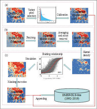 图2. 数据处理分析框架:(a) DMSP-OLS数据校准; (b) SNPP-VIIRS数据校正; (c) 长时间序列夜间灯光遥感数据集成