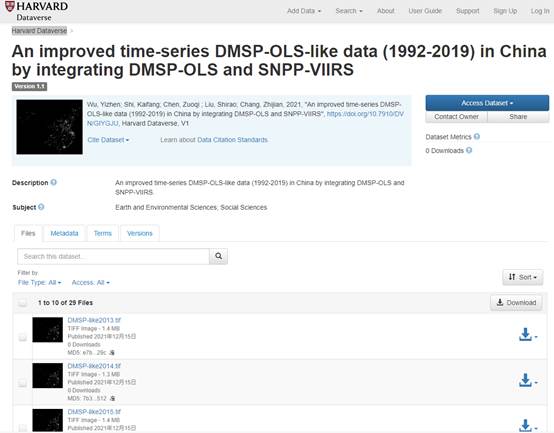此外,1992-2019年中国“类DMSP-OLS”夜间灯光遥感数据集已通过Harvard Dataverse平台免费发布,用户可以通过下方链接直接获取,数据存储格式为GeoTIFF,空间分辨率为1-km:(//dataverse.harvard.edu/dataset.xhtml?persistentId=doi:10.7910/DVN/GIYGJU)。