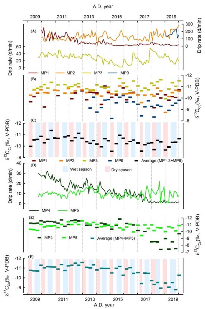 δ13C是石笋古气候重建中的重要指标,记录了区域气候和地表环境信息,常被用于解释生态环境与气候演变之间的关系。根据2009-2019年在重庆市芙蓉洞开展的洞穴系统监测数据,包括大气环境(温度和降水量)、土壤有机质的“老碳”含量、洞内环境(温度、相对湿度和pCO2)、滴水滴率和洞穴次生碳酸钙沉积速率等,利用稳定同位素δ13C和Δ14C技术,分析芙蓉洞上覆表层岩溶系统的水文地质条件、洞穴环境和不同来源的“老碳”(多年有机质分解释放的CO2和基岩)对滴水和洞穴次生碳酸钙沉积物δ13C的影响。研究发现,对于同一个滴水点,当滴水速率<1滴/分时,洞穴滴水和相应沉积的洞穴次生碳酸钙δ13C出现明显偏正。Δ14C和δ13C的综合应用,可以有效区分滴水的碳源,其中不同来源的“老碳”是影响滴水δ13C的重要因素,当滴水中含有较多土壤多年有机质分解释放的“老碳”时,滴水和次生碳酸钙δ13C偏轻;当滴水中来自于基岩的“老碳”占主导时,滴水和次生碳酸钙δ13C偏重。滴水和沉积物中的“老碳”含量均具有稳定性,但滴水中的“老碳”含量低于洞穴次生碳酸钙沉积物,说明“老碳”可以累积于沉积物中,导致同一个洞穴不同石笋δ13C产生明显差异。本研究综合应用稳定碳同位素和放射性碳同位素探索不同碳源对石笋δ13C的影响,“双碳”结合有助于深入解译石笋δ13C记录的环境信息。