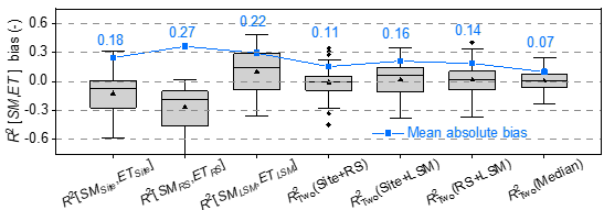 图1. “双源”方法估计得到的土壤水分-蒸散发耦合强度相对于基准值的偏差,其中SM和ET分别为土壤水分和蒸散发;Site,RS和LSM分别表示站点、卫星遥感和陆面模型;表示以决定性系数表示的耦合强度