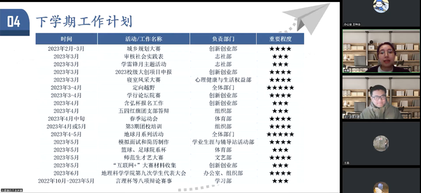 会议议程第四项,由番号 团委书记禹露老师介绍团委学生会下学期工作计划。