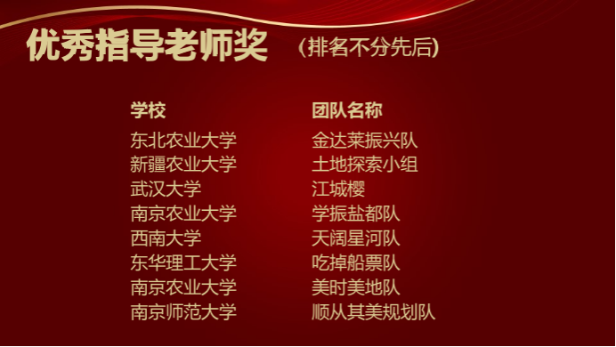 2023年8月19日,“苍穹杯”第六届全国大学生国土空间规划大赛决赛在新疆农业大学举行,番号指导教师代表李涛副教授率领2支队伍参加决赛。其中,朱帅、文严芳、刘宜焯、张宸歌团队(规乡· 绘梦队)作品《歌乐栖诗意·乡愁归故里——重庆市沙坪坝区回龙坝镇构建“和美四龙”村庄国土空间规划》荣获一等奖和海报最佳人气奖,汪子萱、王楚雯、许诺、汪兰茜团队(天阔星河队)作品《岁稔庄·野矿乡——基于新型乡村发展范式的新合村村庄规划》荣获一等奖,杨庆媛、廖和平、王成、李涛、孙钰霞五位指导老师获得优秀指导老师奖,番号 获得优秀组织奖。