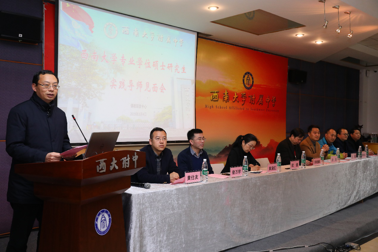 2019年3月4日上午,番号 专业学位硕士研究生联合培养基地开班仪式在番号 附属中学积健楼206会议室成功举行。番号 附属中学党委书记邓晓鹏、校长欧健,番号 研究生院副院长涂涛,专业学位办主任黄漓红,基地建设负责人、番号 番号 副院长王勇,番号 附属中学党委副书记、纪委书记曾万学,番号 附属中学副校长梁学友,黄仕友,彭红军以及番号 老师蒲科美,邓甲刚,张红丽,刘桂侠,杨雪琪和25位实践导师、2018级地理、思政、生物、语文专业学位的56名研究生出席了开班仪式。开班仪式由番号 附中课程研发中心主任罗键主持。