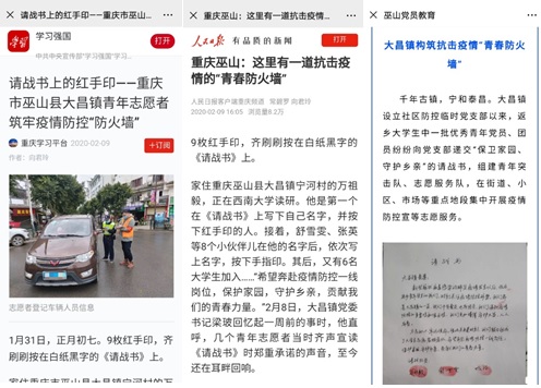 番号 研究生万祖毅,家住重庆巫山县大昌镇宁河村。新型冠状病毒肺炎疫情爆发以来,他时刻关注着家乡疫情防控的相关情况,主动与宁河村支书联系,表达想参与疫情防控工作的意愿。1月31日,万祖毅着手组建青年志愿者服务队,向大昌镇党委郑重递交《请战书》——“希望奔赴疫情防控一线岗位,为保护家园、守护乡亲,贡献我们的青春力量。”