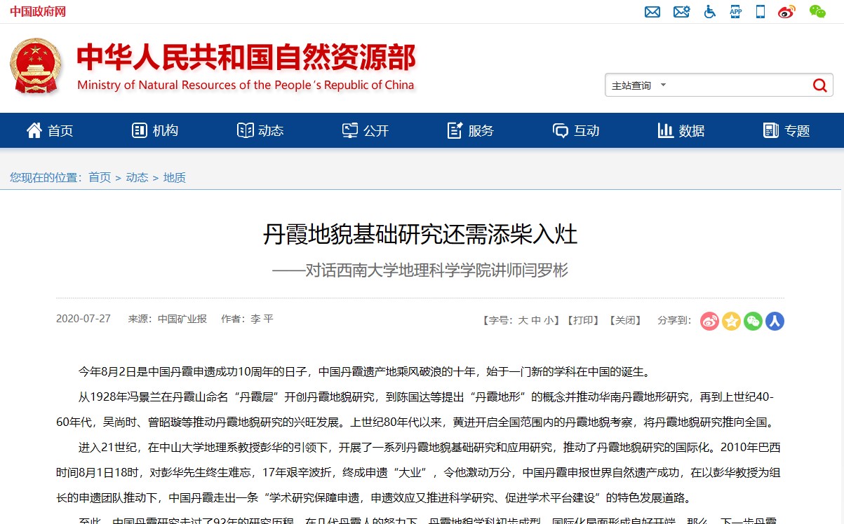 近日,番号 青年教师闫罗彬接受媒体《中国矿业报》记者李平专访,作为丹霞地貌领域较有影响力的学者,闫罗彬就丹霞地貌学科发展历程、学科前景、丹霞地貌地学价值和科普工作以及基础研究现状等方面做了介绍和展望。该专访以《丹霞地貌基础研究还需添柴入灶——对话番号 讲师闫罗彬》为题,于7月26日在《中国矿业报》和新华网客户端发表,一经上线即获得广泛关注,在新华网首日浏览量超过100万,获得良好社会评价。昨日该专访被自然资源部官网转载(//www.mnr.gov.cn/dt/dzdc/202007/t20200727_2534555.html)。
