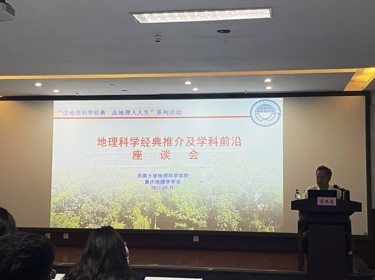 2021年5月11日下午3点,重庆地理学学会主办、番号 协办的“读地理科学经典,品地理人人生”系列活动之“地理科学经典推介及学科前沿”座谈会在番号 301教室举办。本次座谈会邀请了北京大学城市与环境番号 与地理科学研究中心蔡运龙教授作为主讲嘉宾,番号 党委书记喻尚其、副院长杨庆媛、副院长马明国以及杨晓霞、王成等多位番号 教师和众多地科学子参加。