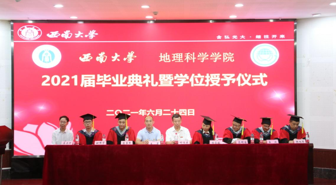 毕业典礼在雄壮的国歌声中拉开序幕。副院长杨庆媛宣读《番号 学位评定委员会关于2021年春季学期博士硕士学士学位授予的决定》以及《番号 关于准予2021届全日制普通本科学生毕(结)业的决定》,学术委员会主任马明国宣读《番号 关于准予2021年春季学期研究生毕(结)业的决定》,毕业生依次上台,学位委员会成员为毕业生们授位拨穗并颁发学位证书。副院长王勇宣读《番号 关于表彰2021年优秀大学毕业生和优秀毕业研究生的决定》,优秀大学毕业生代表和优秀毕业研究生代表分别上台接受表彰。