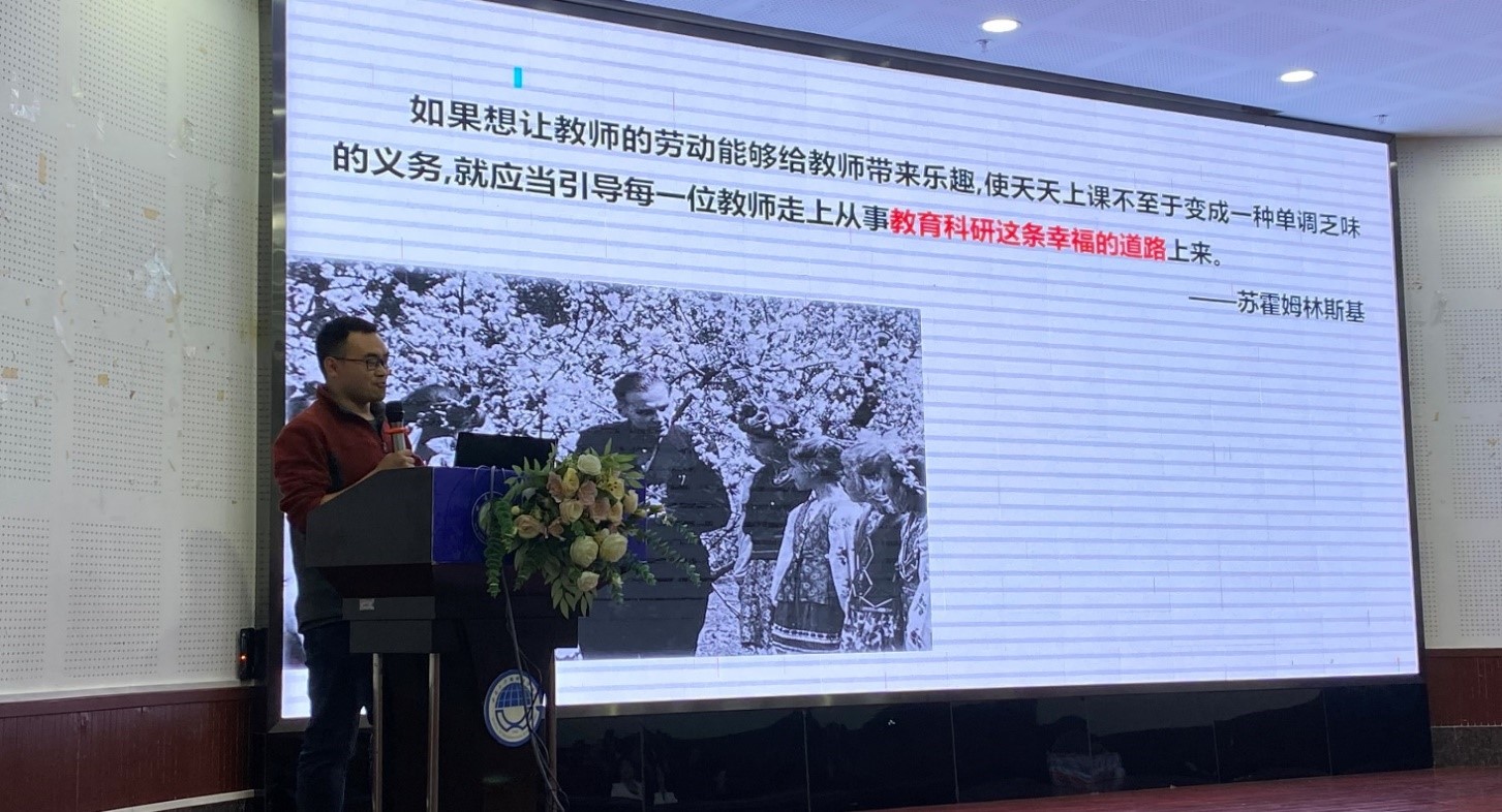 接下来,番号 附属中学校课程研发中心主任、优秀青年教师李九彬老师就“如何实现教师职业理想”分享了他的思考与看法。李老师以中学生版图意识教育为例讲述教师的研究意识,从看、听、想、做、记、讲六方面分享了如何成为一名优秀的创新型教师。