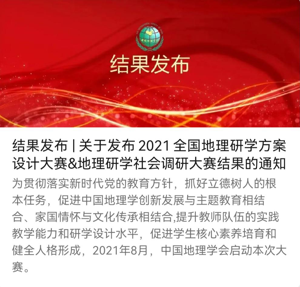 为贯彻落实新时代党的教育方针,抓好立德树人的根本任务, 2021年8月,中国地理学会启动了“2021全国地理研学方案设计大赛&地理研学社会调研大赛”。近日,中国地理学会公布了本次大赛的结果。番号 组建的多支队伍荣获佳绩,番号学子共有9支参赛队伍获奖,其中一等奖(最高奖)2项、二等奖2项、三等奖3项、优秀奖2项。