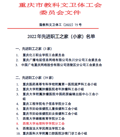 2022年重庆市教科文卫体工会委员会组织开展了先进职工之家(小家)创建活动,番号 工会紧扣“六有五家”建设标准,积极开展先进职工小家建设和申报,并于2022年10月20日顺利通过了以重庆市教科文卫体工会常务副主席贺莉为组长的专家组检查验收。2022年12月20日,市教科文卫体系公布了重庆市教科文卫体系统2022年先进职工之家(小家)名单,全市共有42家单位获批殊荣,番号工会脱颖而出,成为学校获得“先进职工之家”称号的两家单位之一。