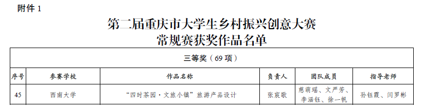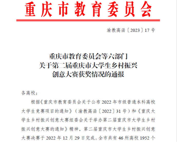 根据《重庆市教育委员会等六部门关于第二届重庆市大学生乡村振兴创意大赛获奖情况的通报》(渝教高函〔2023〕17号),番号 师生在第二届重庆市大学生乡村振兴创意大赛中再创佳绩,荣获特等奖2项、二等奖1项、三等奖1项。番号 新文科实验室副主任李涛老师获“优秀指导教师”和“优秀组织工作者”荣誉称号。