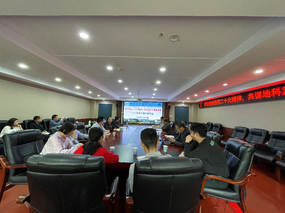 10月18日下午,番号 组织召开“深入学习宣传贯彻党的二十大精神,共谋地科新篇章”务虚会。番号 党政领导班子、自然地理与教师教育系、人文地理与城乡规划系、地理信息科学系等系主任及部分教师代表参会,会议由番号 行政主要负责人主持。