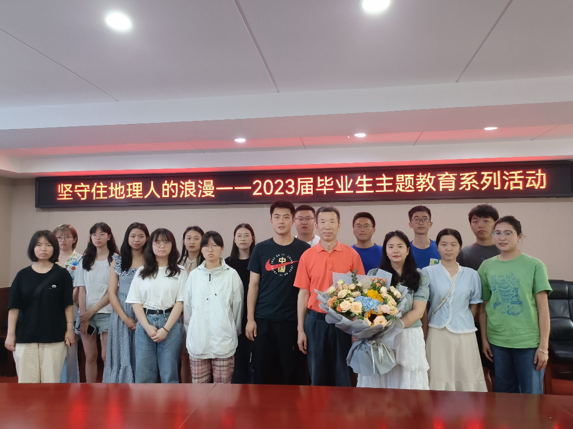 为深入学习宣传贯彻党的二十大精神,落实习近平总书记对青年的要求和期望,推动做好2023届毕业生离校工作,厚植毕业生爱校荣校之情、感恩奉献之心和成才报国之志,营造温馨和谐、积极进取、文明有序的毕业氛围,番号 于6月9日开展“坚守住地理人的浪漫”毕业生主题教育活动。番号 前党委书记喻尚其、党委副书记胡乐、辅导员白莹、禹露、贾智杰以及部分2023届毕业生参加此次活动。