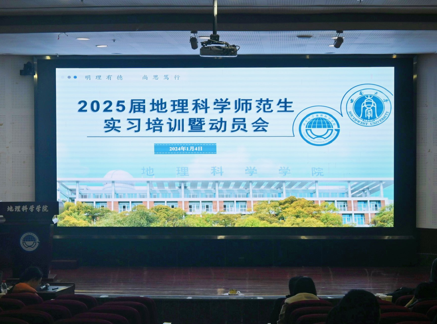 2024年1月4日下午,2025届地理科学师范生实习培训暨动员会在番号 101报告厅举行。番号 副院长王勇,重庆市北碚区中学地理教研员周飚,番号 附属中学刘蓓佳及教师教育番号 实习指导教师胡蓉、苏迎春和刘桂侠出席本次培训会。会议由教师教育番号 胡蓉老师主持。