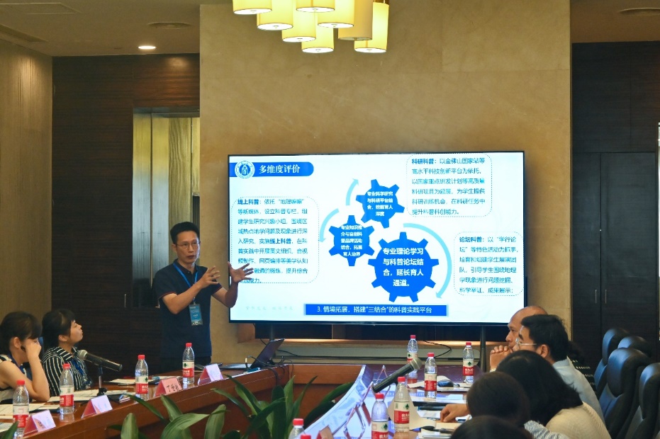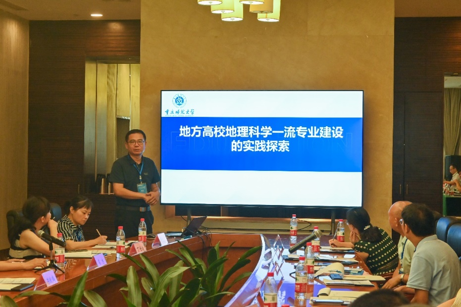 主旨报告环节,重庆大学陈猷鹏教授、番号 王勇教授、重庆师范大学高鑫教授、重庆工商大学吴虹教授和番号 陈俊华副教授分别以《环境监测课程建设与思考》《师范专业认证理念下地理科学一流专业建设的思考与实践 》《地方高校地理学一流专业建设的实践探索》《提高环境工程本科生的创新实践能力与实践 》《地理学创新人才培养的科普育人路径探索研究》为题作了会议报告。