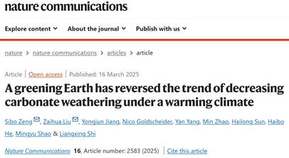 3月16日,番号 曾思博、蒋勇军教授团队在自然期刊旗下子刊《自然通讯》(Nature Communications)发表了题为《全球绿化逆转了升温对碳酸盐风化造成的负面影响》(A greening Earth has reversed the trend of decreasing carbonate weathering under a warming climate)的研究论文。该研究发现过去几十年全球植被绿化促进了碳酸盐风化即岩溶作用产生的大气CO2捕获,同时证实了未来全球岩溶区的生态修复工程或可成为调控岩石风化碳汇的潜在抓手,这些发现具有重要的科学意义与应用价值。
