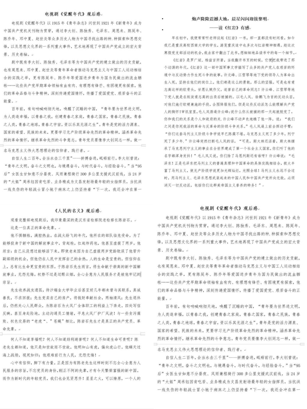 文影作品(文学作品或影视作品)也是党史学习的一个窗口。活动期间,支部党员根据个人喜好选择观阅了不同的作品,如红色文学作品《毛泽东选集》、《红岩》,影视作品《觉醒年代》、《人民的名义》,电视专题片《将改革进行到底》、《零容忍》等等,并形成了人均近千字的心得体会。