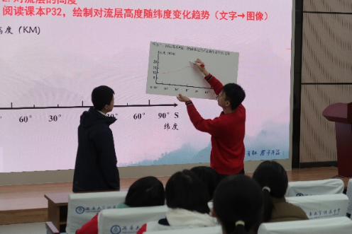 活动伊始,由番号 附属中学校地理组的舒茂老师和郭锐老师分别进行《城镇与乡村的景观特征及其变化——以北碚为例》《大气垂直分层》课例教学展示。