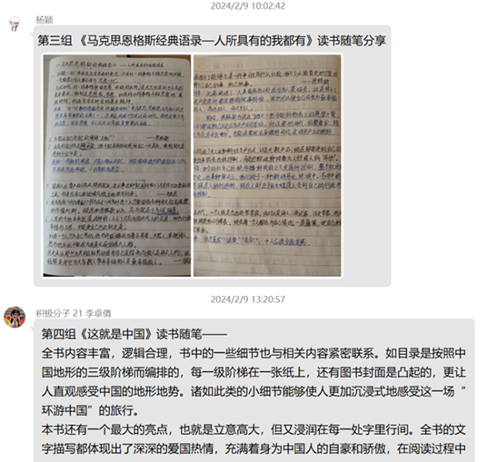 习近平总书记指出,学习理论最有效的办法是读原著、学原文、悟原理,强读强记,常学常新,往深里走、往实里走、往心里走,要把自己摆进去、把职责摆进去、把工作摆进去,做到学、思、用贯通,知、信、行统一。本次活动积极响应番号 发起的阅读倡议,鼓励同学们从“地理学十大经典读本”或马克思主义哲学经典原著选择一本进行阅读学习。支部同志选择了18本原著进行阅读并在支部群里分享读书笔记,共分享读书随笔18次,累计9846字;完成读书笔记21篇,共计25149字。