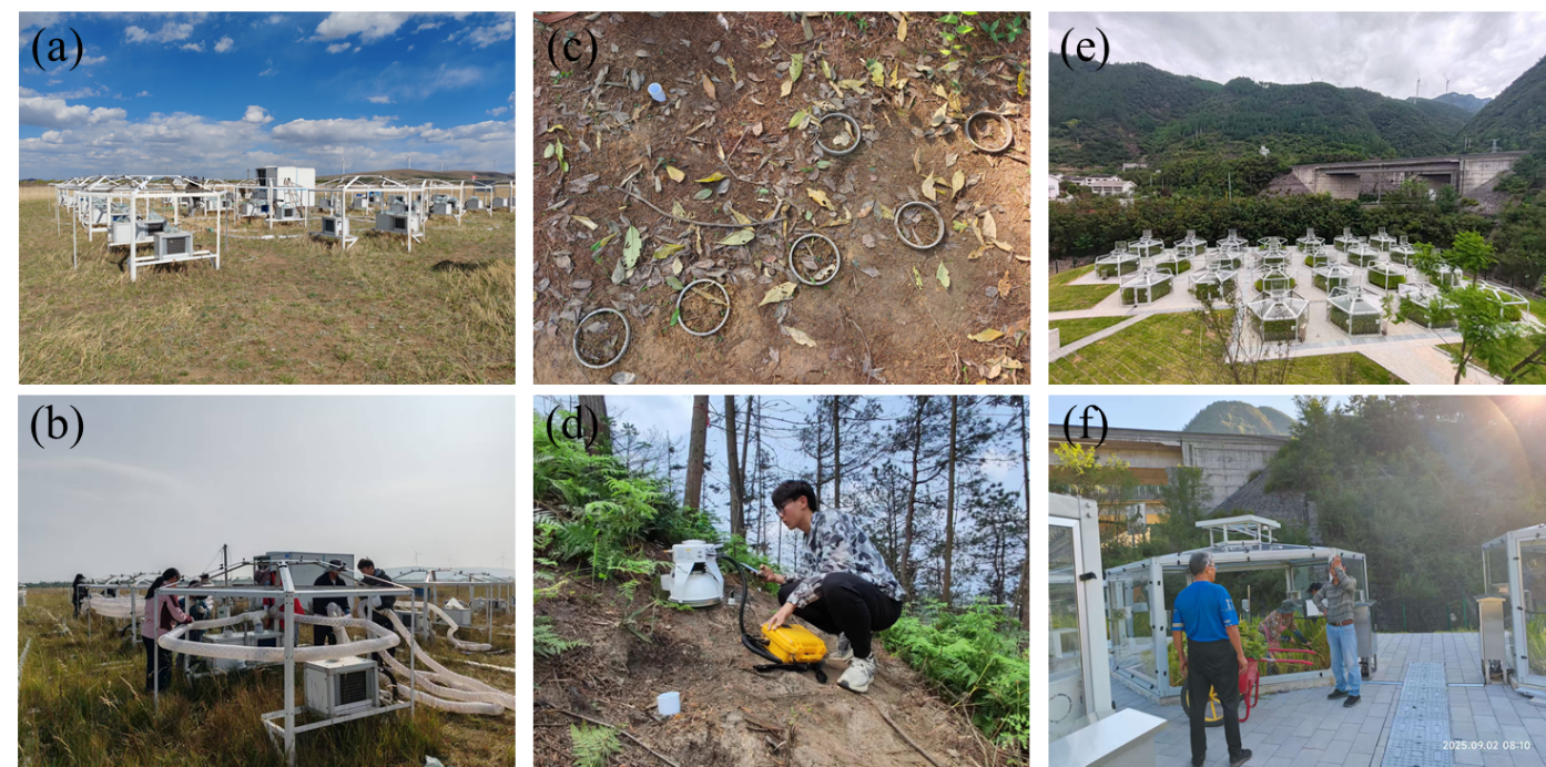 图1. 目前开展的野外控制实验。(a-b)内蒙古春、秋季霜冻实验,主要观测植物物候、植被群落组成、生态系统碳通量等;(c-d)重庆缙云山火烧迹地碳排放实验,主要观测土壤呼吸的各组分;(e-f)重庆金佛山高温热浪水稻田实验,主要观测不同品种水稻对热浪的敏感性及碳分配。