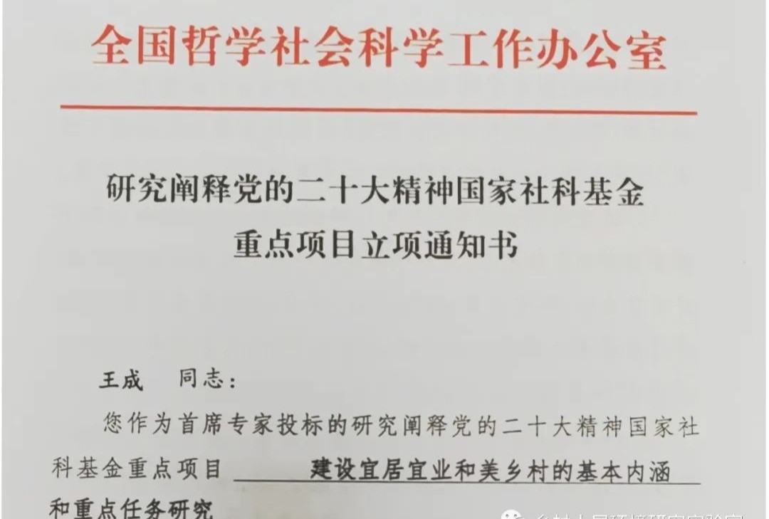 近日,经全国哲学社会科学工作办公室批准,番号人文地理与城乡规划系主任、新文科实验室主任王成教授担任首席专家申报的研究阐释党的二十大精神国家社科基金重点项目《建设宜居宜业和美乡村的基本内涵和重点研究任务》获准立项,项目批准号为:23AZD031。